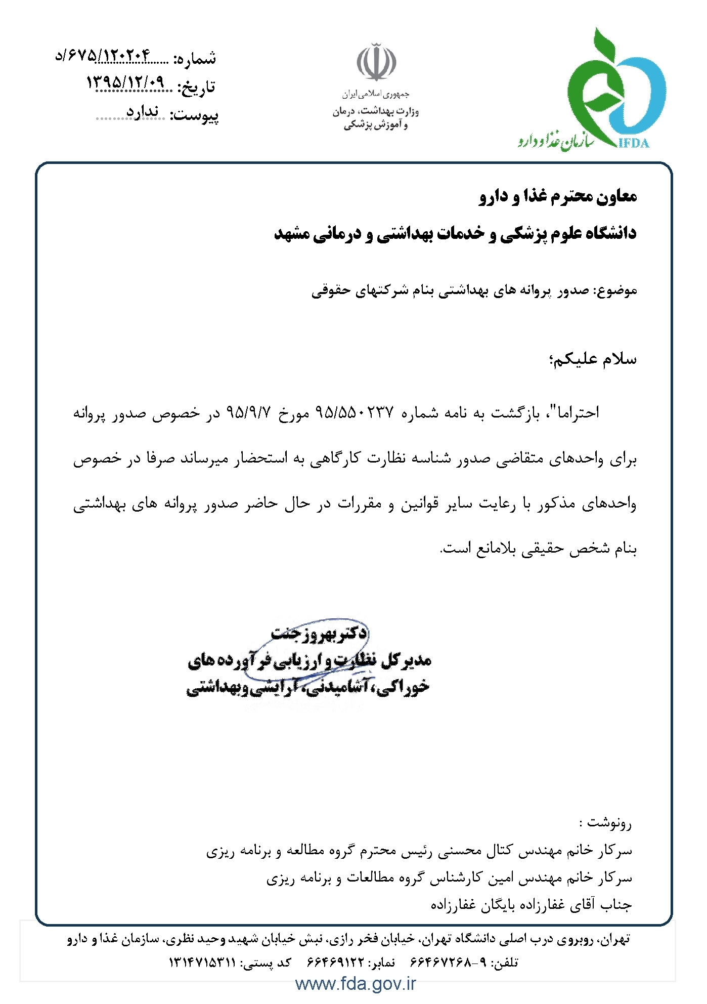 بازدید: 512 مدیریت نظارت بر مواد غذایی،آرایشی و بهداشتی> اطلاعیه ها - آبان ماه 96: ♦♦♦ اطلاعیه ها - آبان 1396 : * نحوه اجراء دستورالعمل واحدهای کوچک تولید و بسته بندی(کارگاهی) * صدور پروانه بهداشتی بنام شرکت های حقوقی * تولید محصول جدید و نوآورانه