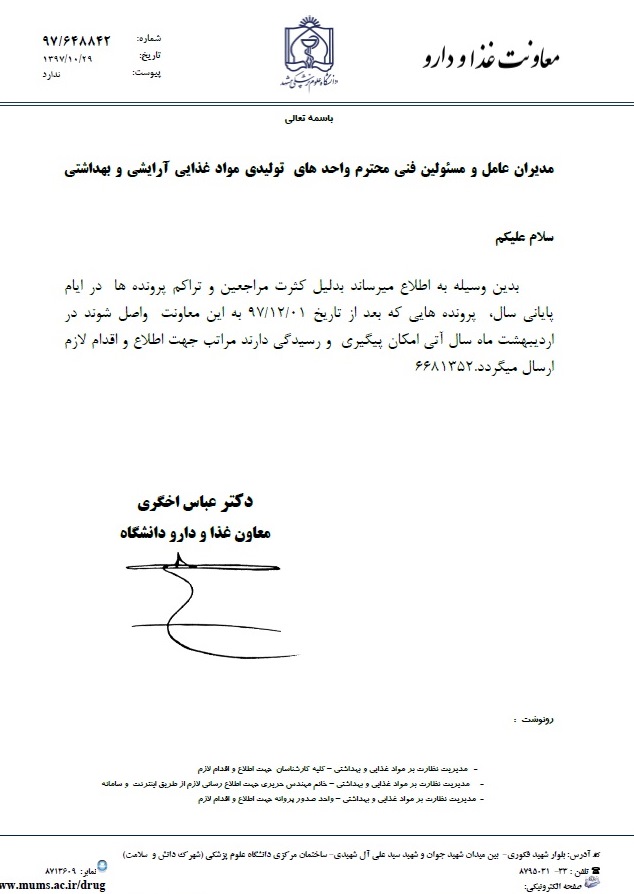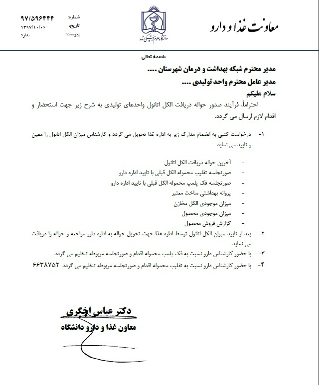 بازدید: 348 مدیریت نظارت بر مواد غذایی،آرایشی و بهداشتی>اطلاع رسانی> اطلاعیه ها - دی ماه 97: ♦♦♦ اطلاعیه ها - دی 1397 : * فرآیند صدور حواله دریافت الکل اتانول واحدهای تولیدی * آشنایی با نشانگر رنگی تغذیه ای * آشنایی با قوانین و مفاهیم محصولات تراریخته * سامانه کشوری استعلام پروانه های بهداشتی سازمان غذا و دارو * مهلت ارسال مدارک جهت پاسخگویی در سال 97 * تمدید پروانه های ساخت محصولات نوآورانه