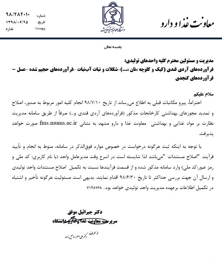 بازدید: 282 مدیریت نظارت بر مواد غذایی،آرایشی و بهداشتی>اطلاع رسانی> اطلاعیه ها - شهریور ماه 98: ♦♦♦ اطلاعیه ها - شهریور 1398 : * جمع آوری حشره کش غیر مجاز ICON * لیست محصولات غیر مجاز * قابل توجه واحدهای تولیدی فرآورده های آردی،قندی،حجیم شده،کنجدی،نبات،آبنبات و ... * دستورالعمل نحوه صدور،اصلاح،تمدید پروانه های بهداشتی انبارها ++پیوست1 ++پیوست2 * گواهینامه رعایت حقوق مصرف کننده * ممنوعیت استفاده از بلانکیت در نان سنتی * دستورالعمل بررسی صدور،تمدید،لغو مجوزهای بهداشتی ++پیوست * ثبت نام شرکت ها در سامانهTTAC ثبت نام شرکت ها در سامانهTTAC ++پیوست