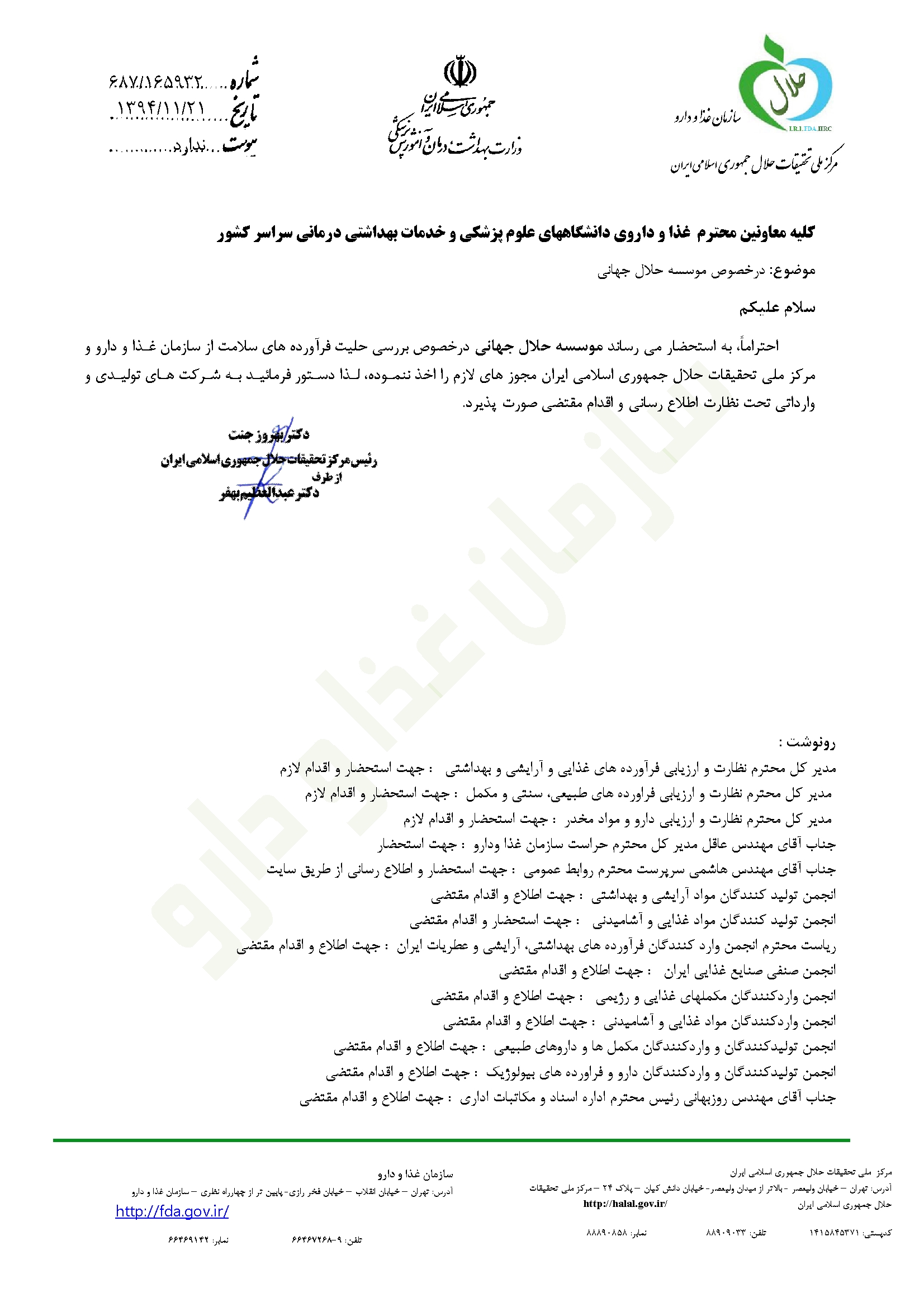 بازدید: 500 مدیریت نظارت بر مواد غذایی،آرایشی و بهداشتی> اطلاعیه ها-بهمن ماه 94: ♦♦♦ اطلاعیه ها - بهمن 1394 : * موسسه حلال جهانی * برون سپاری صدور،تمدید و اصلاح پروانه ساخت به دفتر پیش خوان خدمات دولتی * *