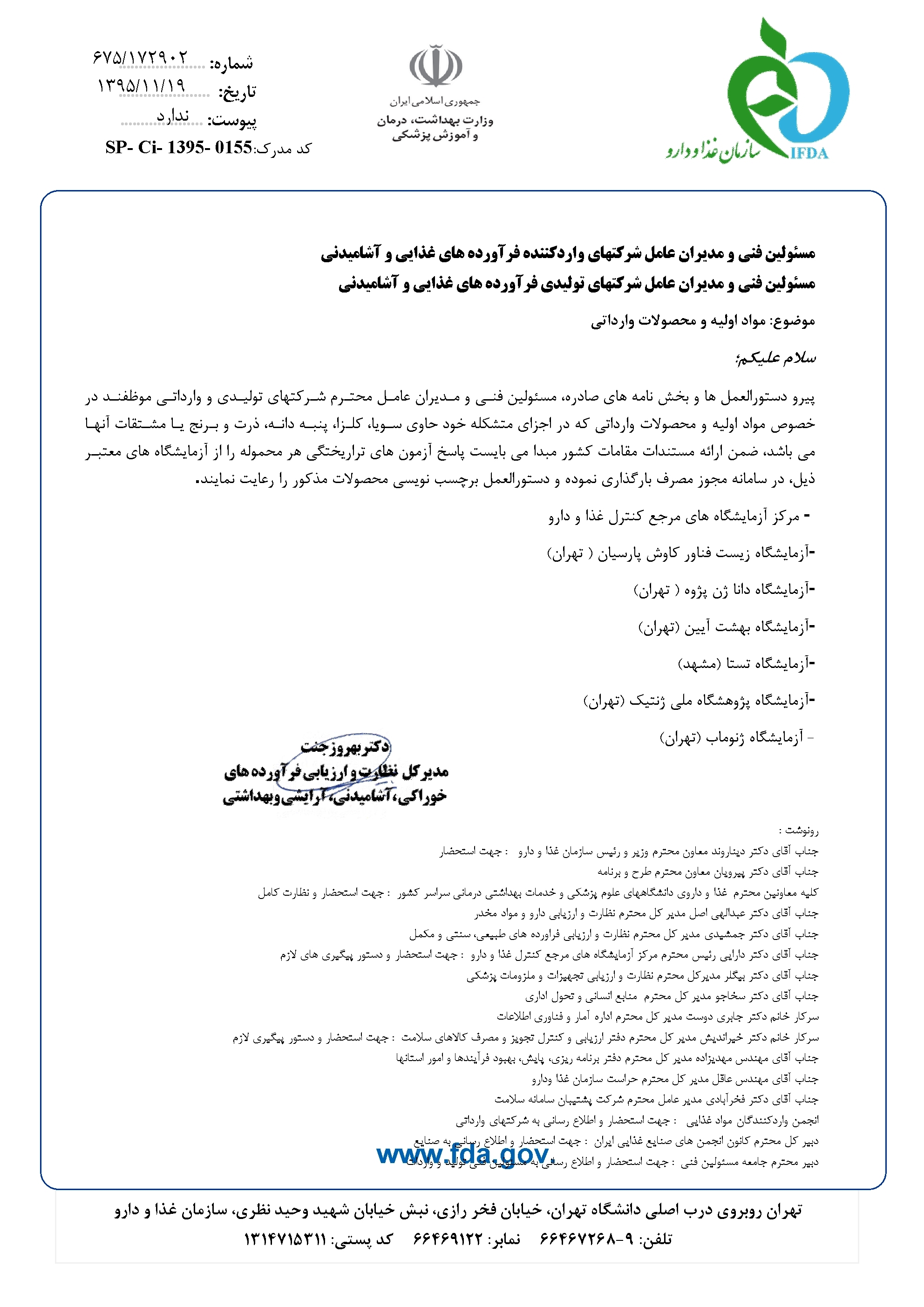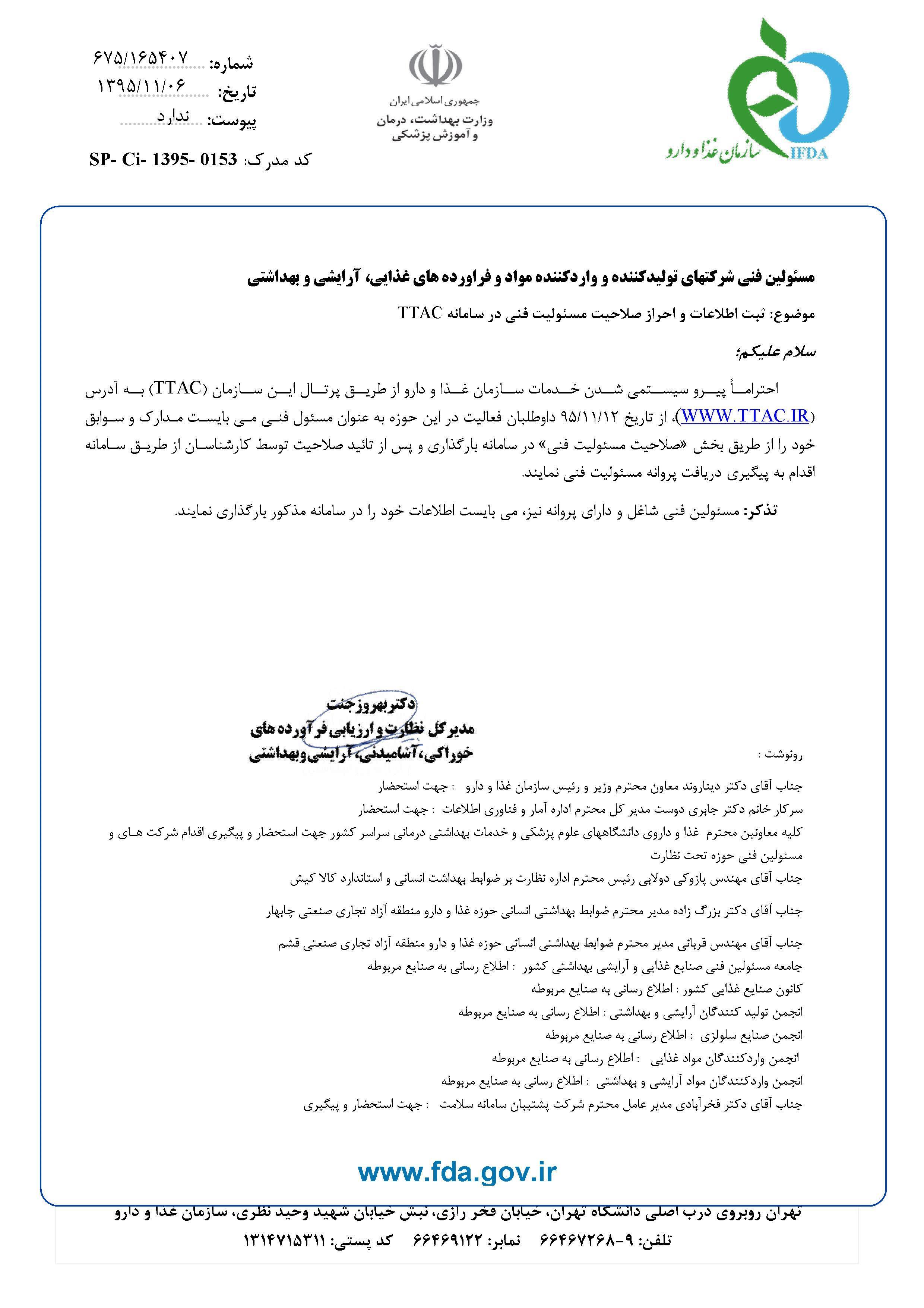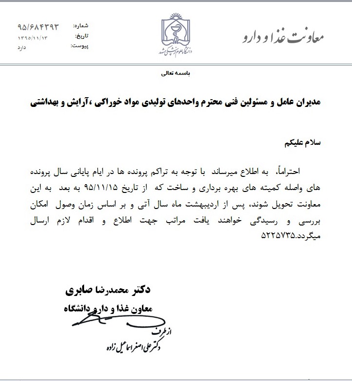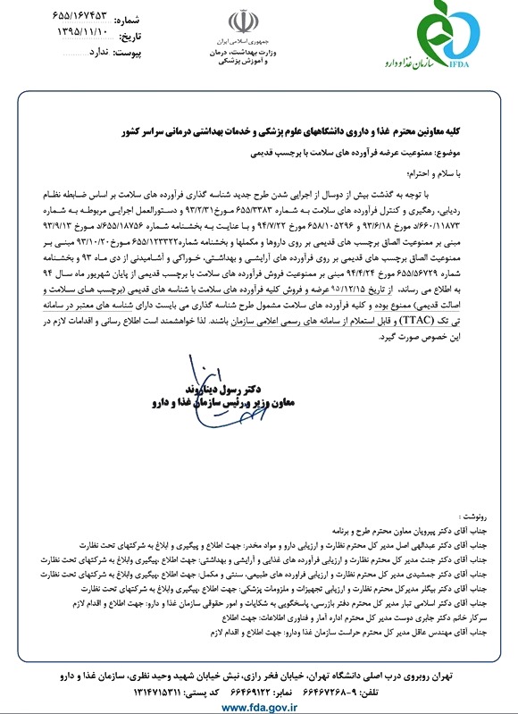 بازدید: 469 مدیریت نظارت بر مواد غذایی،آرایشی و بهداشتی> اطلاعیه ها-بهمن ماه 95: ♦♦♦ اطلاعیه ها - بهمن 1395 : * مواد اولیه و محصولات وارداتی * ممنوعیت عرضه فرآورده های سلامت با برچسب قدیمی * ثبت اطلاعات و احراز صلاحیت مسئولین فنی در سامانه TTAC * مهلت زمان پذیرش پرونده جهت کمیته های بهره برداری و ساخت در سال 95 * ثبت اطلاعات صدور گواهی حلال در سامانه TTAC