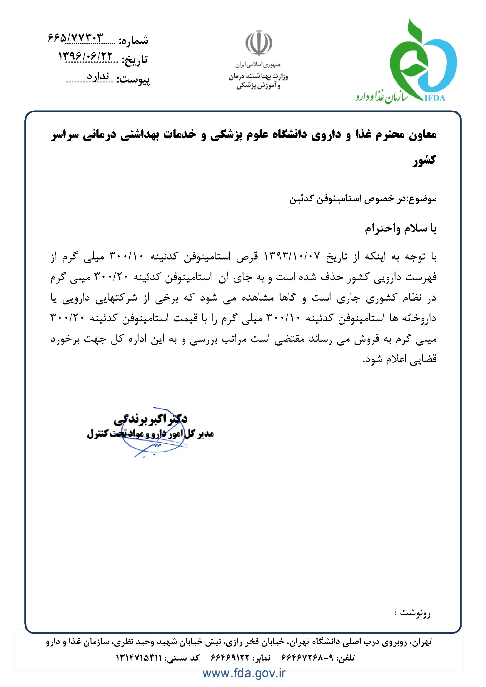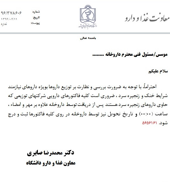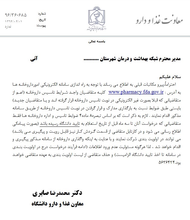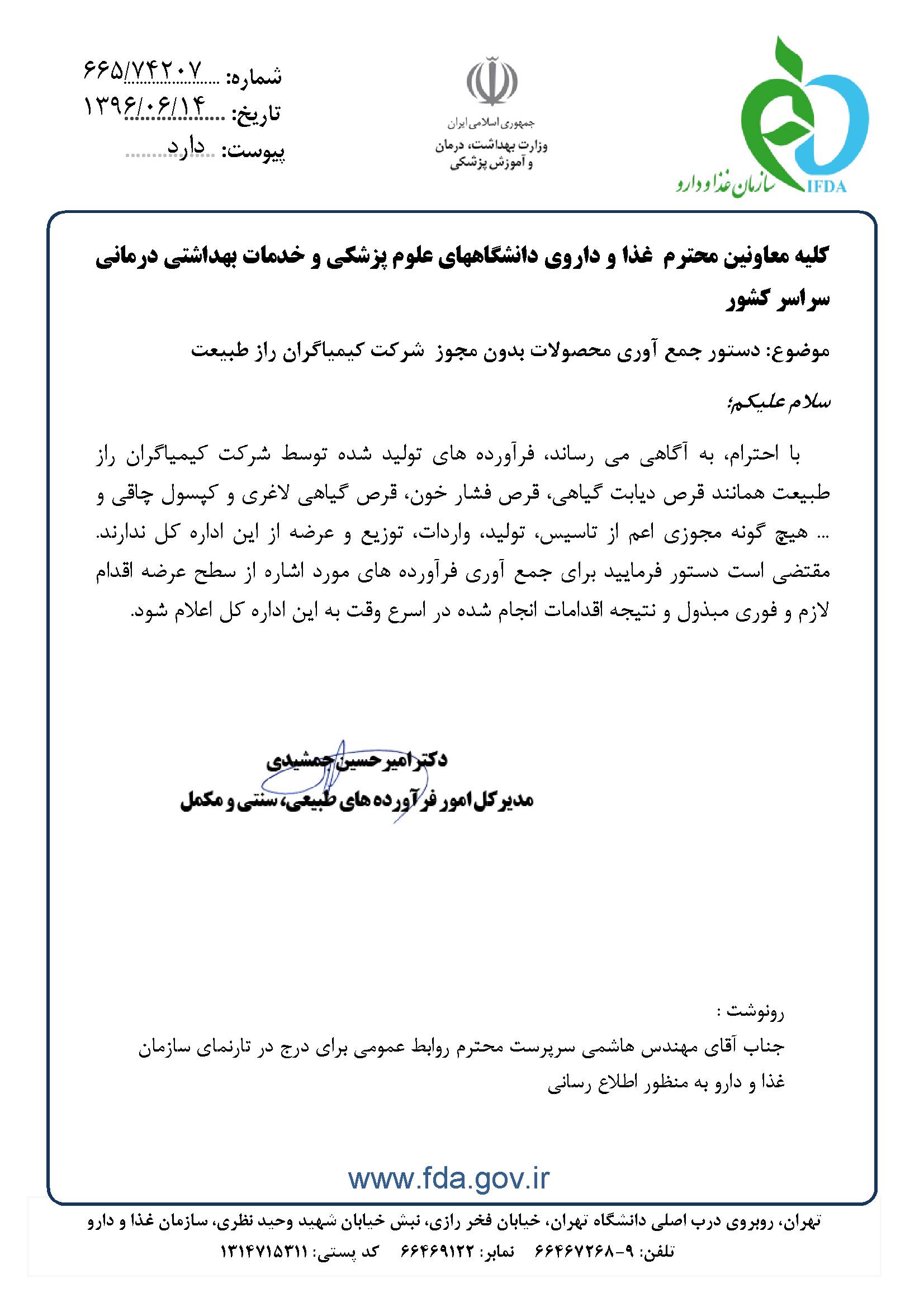 بازدید: 653 مدیریت نظارت بر امور دارو و مواد مخدر> اطلاعیه ها-شهریور ماه 96: ♦♦♦ اطلاعیه ها - شهریور 1396 : * سامانه یکپارچه ثبت کمبودهای دارویی * سامانه الکترونیکی امور داروخانه ها * اعلام مناطق ارائه خدمات داروئی شبانه روزی * نظارت بر توزیع داروهای نیازمند به شرایط زنجیره سرد * جمع آوری محصولات بدون مجوز کیمیاگران راز طبیعت * جمع آوری فرآورده های واحد توزیع فرآورده های طبیعی با نام طب اسلامی * اطلاع رسانی استفاده از سامانه گزارش دهی آنلاین ADR * نظارت بر قیمت استامینوفن کدئین