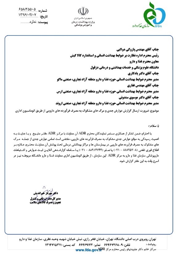بازدید: 600 اداره تحقیق و توسعه> اطلاعیه ها - خرداد ماه 96: ♦♦♦ اطلاعیه ها - خرداد 1396 : * ارسال گزارش عوارض مصرف فرآورده های دارویی از طریق اتوماسیون اداری ++ پیوست 1 *